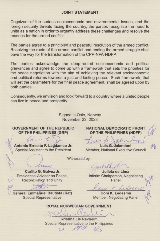 We, the undersigned, reiterate our steadfast support to the resumption of the formal peace negotiations between the Government of the Republic of the Philippines (GRP) and the National Democratic Front of the Philippines (NDFP). The Oslo Joint Statement signed last November 2023, that aimed for a principled and peaceful resolution to the more than 50-years of armed conflict, is an important and critical milestone in the path towards building a just and lasting peace in the Philippines. Pursuing the GRP-NDFP peace process offers a valuable opportunity for nation-building, healing, and reconciliation needed by conflict-affected communities, particularly indigenous communities who continue to bear the brunt of this conflict, indeed, the entire nation.