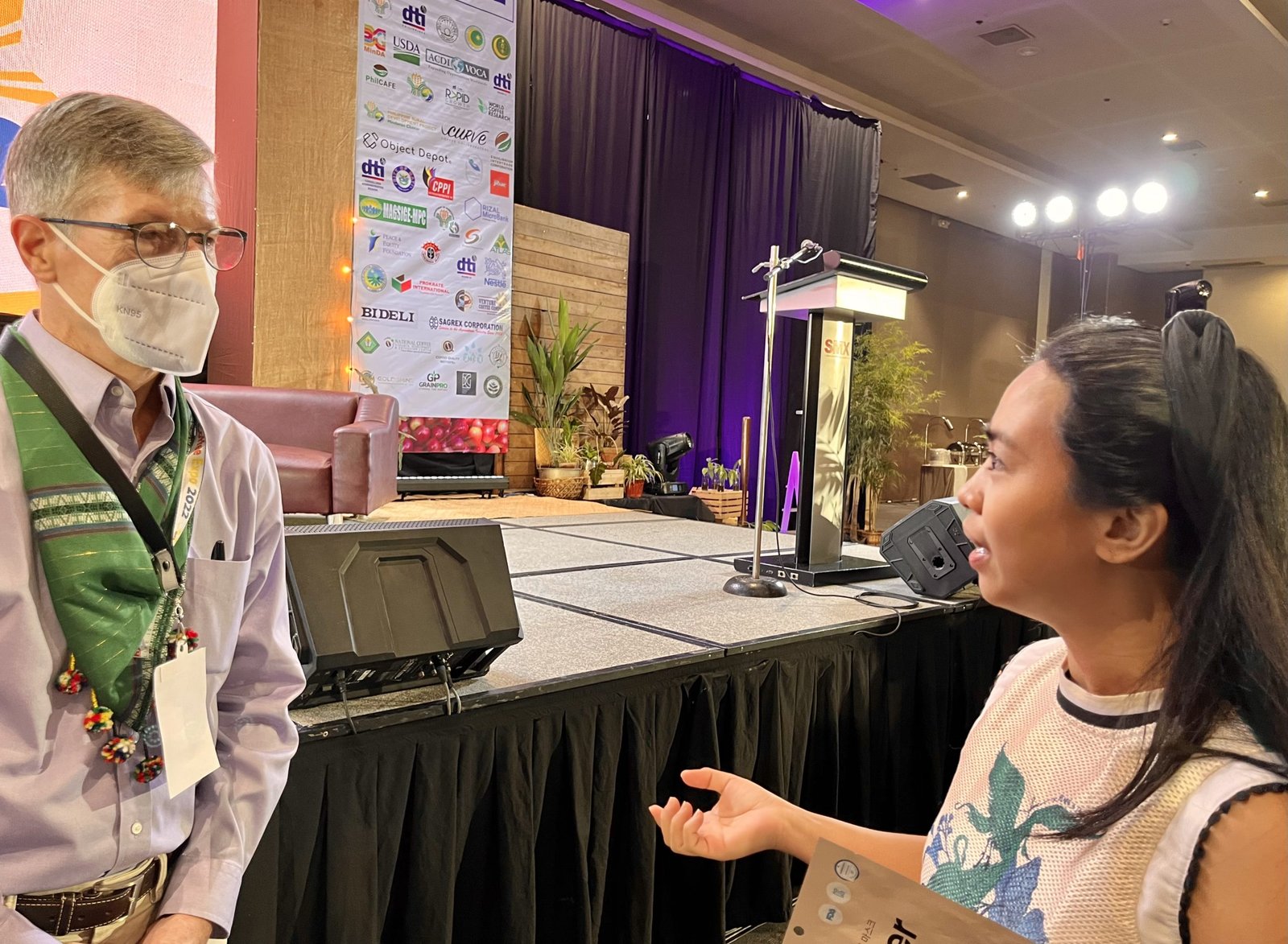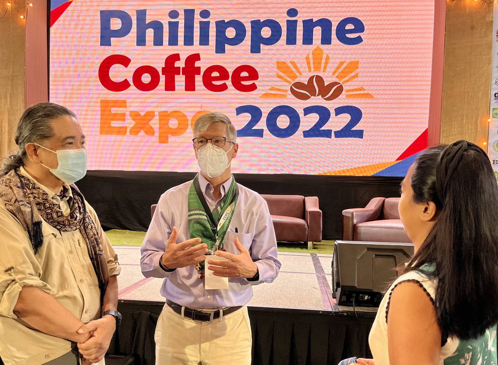 Post plenary conversations and photo ops. After the plenary sessions at the Philippine Coffee Expo 2022, we had a chance to talk about coffee and peace with those who stayed. T.J. Ryan (ACDI VOCA) and Tala Alngag Bautista (CFP PBCI) shared thoughts about ‘conflict transformation’ in coffee farming communities affected by land-based violence.