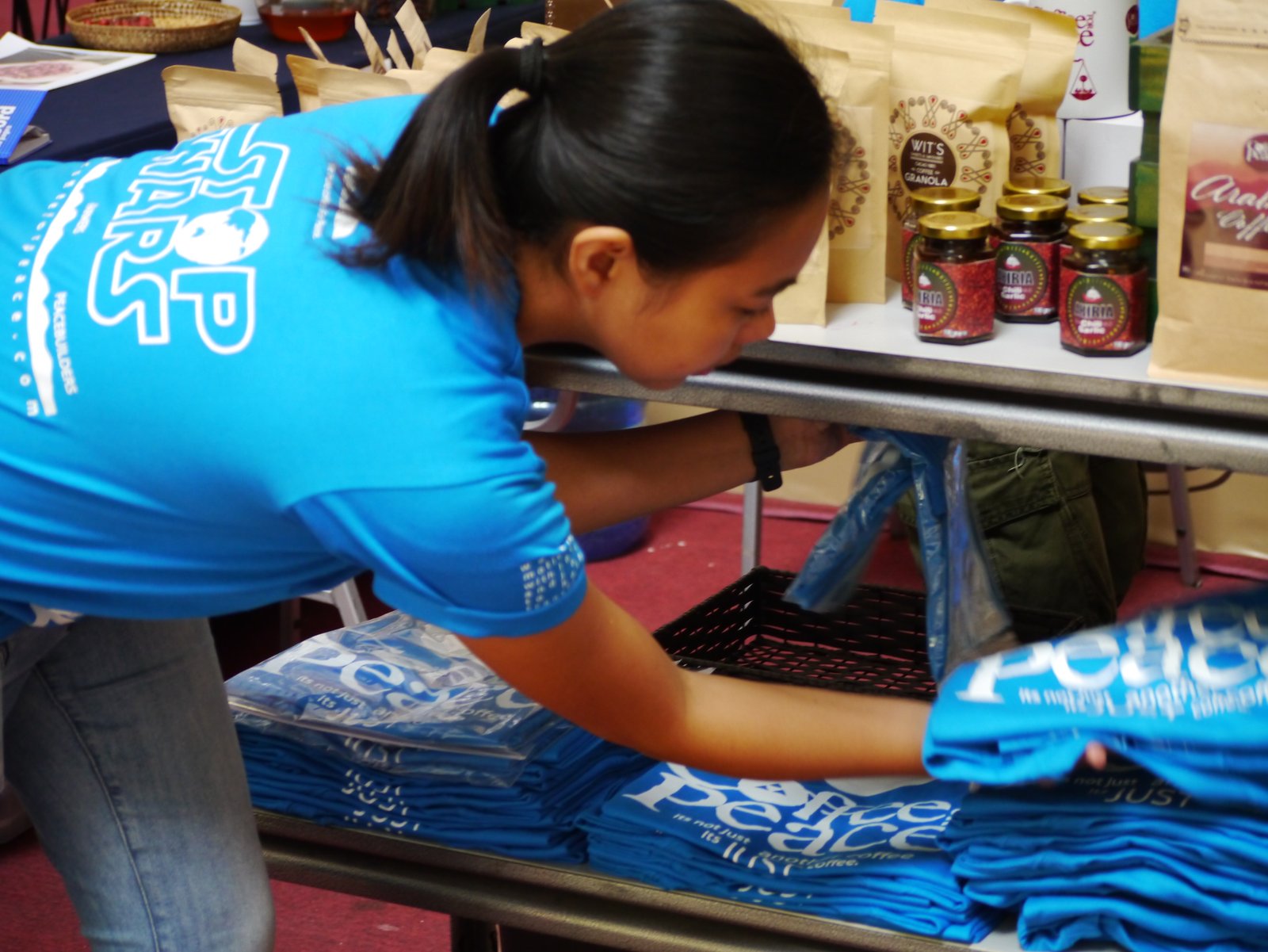 Aiza’s team offered a limited amount of “WildCat” (civet) coffee, newly-roasted 100% brewed Arabica, delicious “Coco-Coffee,” “StopWar” T-Shirts (blue only), “Wits” coffee-flavored granola, “Akiria” chili hot paste, “JustCoffee” mugs. Our booth was open from 10AM to 9PM.