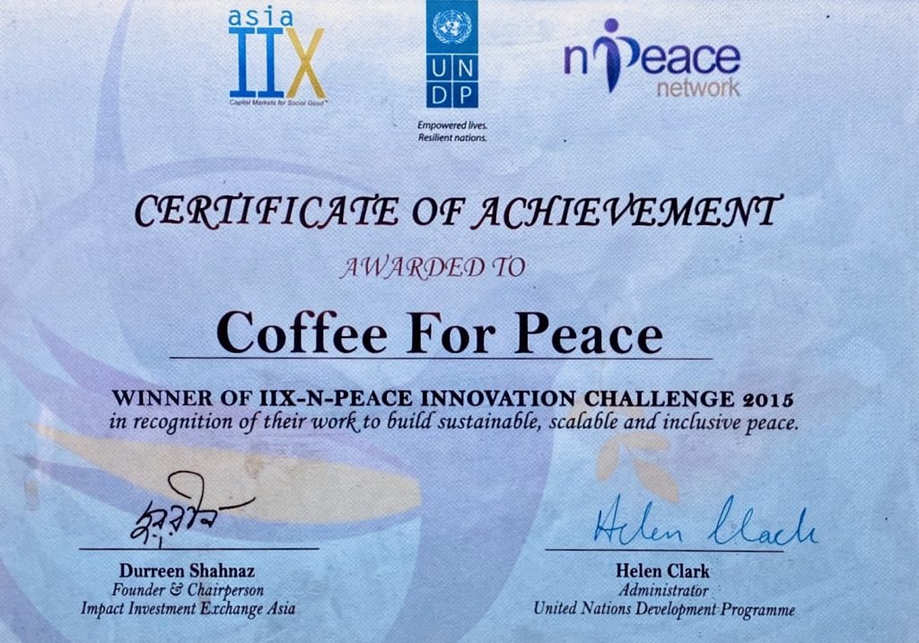 “The N-Peace Awards,” according to a UNDP brochure, “identifies and celebrates the power of women as agents of change, focusing on making visible the untold stories of women leaders and their male allies.” CFP specifically won the IIX N-Peace Innovation Challenge. “The challenge,” according to the organizers, “is an enterprise competition that aims to accelerate the peacebuilding agenda by supporting Impact Enterprises working to empower women, engage youth, and catalyze innovation and technology. The challenge is an opportunity for Impact Enterprises that have a positive influence in Myanmar, Indonesia, the Philippines, Afghanistan, Pakistan, or Nepal to show their social impact.” Coffee For Peace met the challenge based on a thorough N-Peace Diagnostic Study.